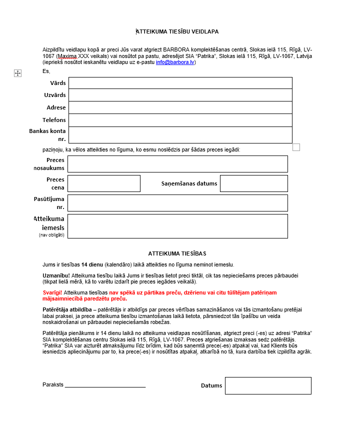 Jūs varat izmantot atteikuma tiesības 14 dienu laikā pēc pasūtījuma saņemšanas vienpusēji atsakoties no pasūtījuma/preces. Lai to izdarītu, lūdzu aizpildiet atteikuma veidlapu un nosūtiet to uz [email protected] pēc iespējas ātrāk. Atteikuma tiesības varat izmantot normatīvajos aktos noteiktajos gadījumos.